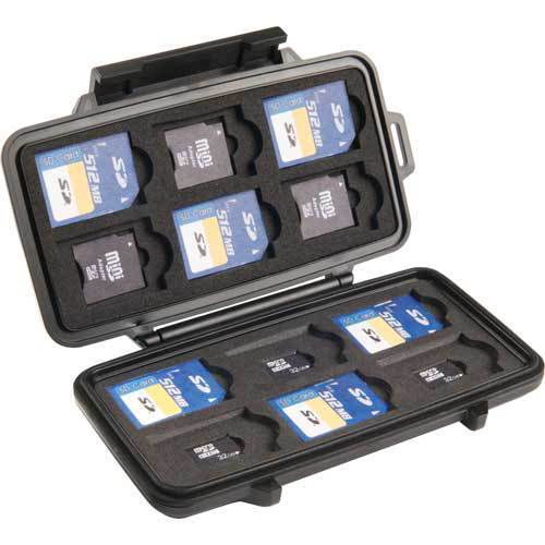 - Stores 12 SD cards, 6 mini SD cards and 6 micro SD cards* - Insert liner absorbs shock and protects memory cards - Made of tough Polycarbonate resin - Water resistant seal (IPx4)