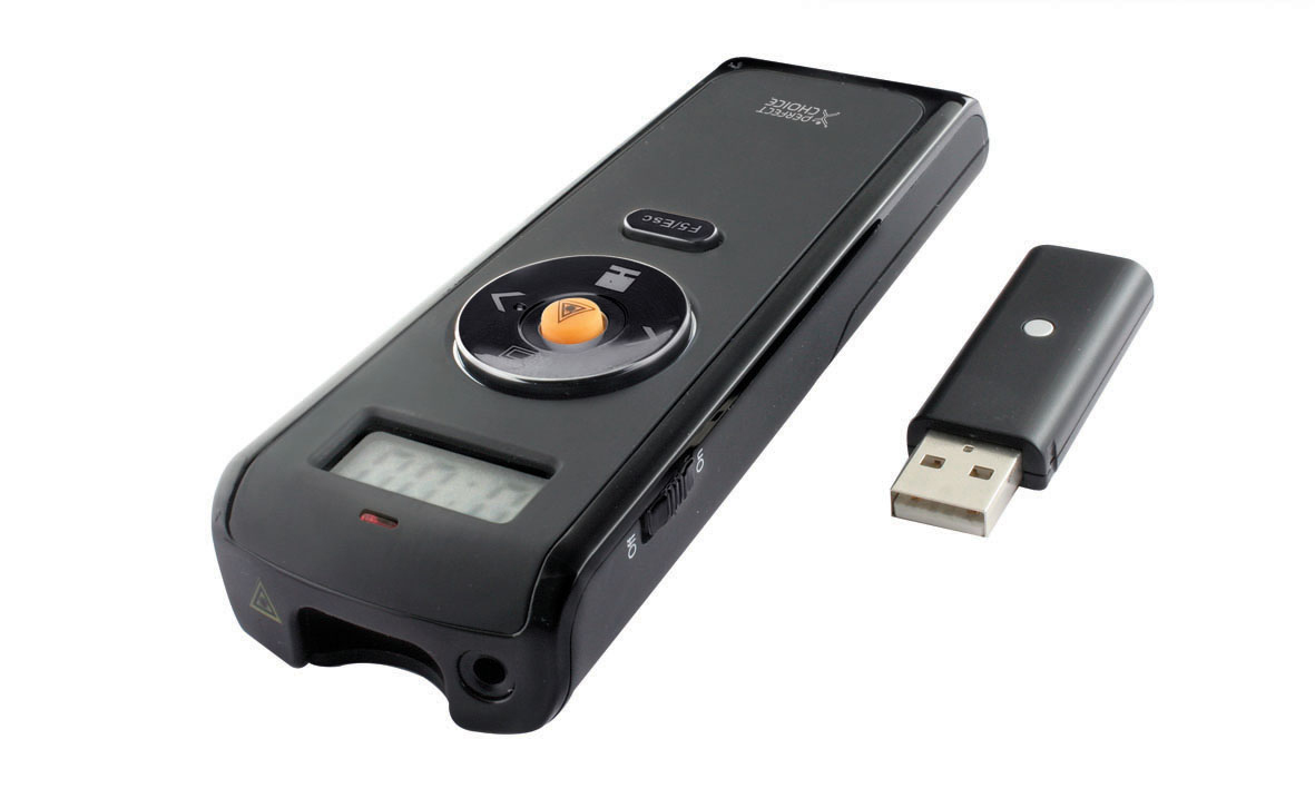 Perfect Choice Presentador Laser. Wireless range: 25 m. Battery type: AAA. Wireless receiver interface: USB. Colour of product: Black. Dimensions (WxDxH): 44 x 125 x 22 mm