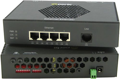 eXP-4S110-RJ Fast Ethernet PoE Ethernet Extender Kit with 1 x eX-4S110L-RJ PoE ethernet extender and 1 x eXP-4S110E-RJ PoE ethernet extender. One 48V 65W Adapter included