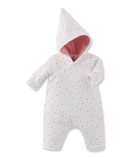 This long one-piece is the footless hooded version, made from quilted tubic cotton with a small star print. This garment opens easily on the side, corresponding perfectly to the one-piece's crossover shape. The irresistible little detail? The pointed hood, reminiscent of an elf.