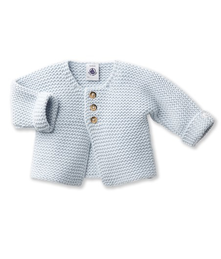 A must-have! This unisex cardigan, in wool and cotton garter stitch, is seamless at the shoulders and forms a "T" shape, perfectly suited for babies. The three little faux wood buttons give this baby's cardigan a sophisticated look. An essential baby garment that can be worn with many outfits.
