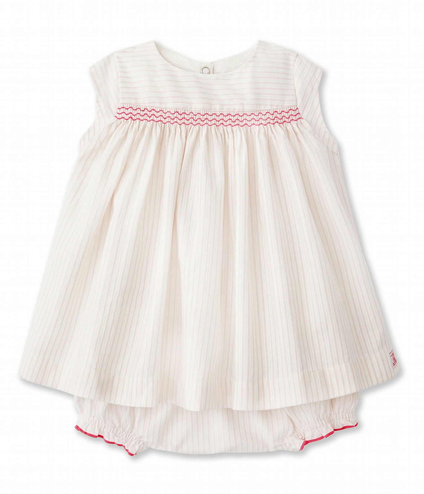 You won't resist this lovely baby dress and bloomer set made in embossed poplin in fresh summer colours. The smocked and gathered front yoke adds volume to the dress. The bloomers are elasticated and can also be worn with a collared bodysuit and knit cardigan for a more casual look. Fabric: 100% cotton