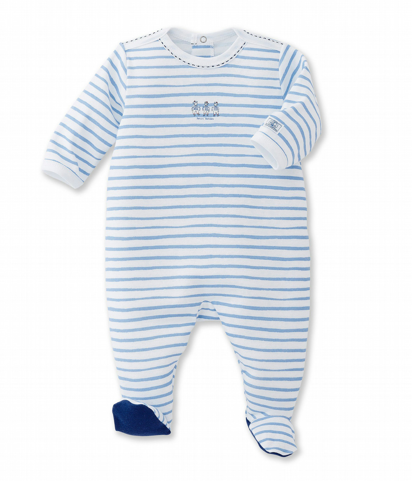 This baby boy sleepsuit made in 1x1 rib features a pastel stripe print that looks hand-painted. Note the charming details on the sailor collar and the three little sailors on the front of this baby pajama. The back bridge opening makes it easy to dress baby.