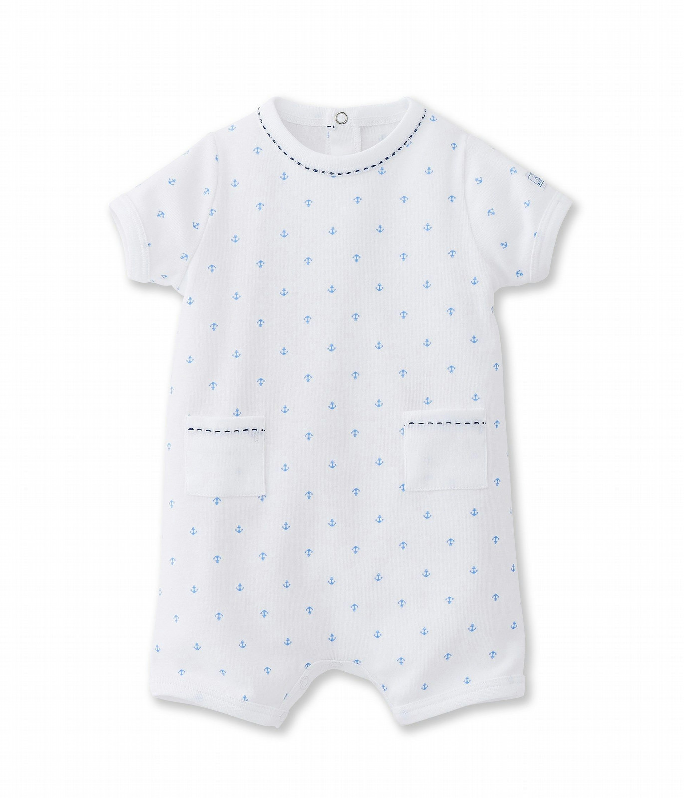 This baby boy shortie in 1x1 rib printed with anchors has two little patch pockets on the front accented with contrasting saddle stitching. Note the bridge opening on the back of this baby item. A light shortie with a fresh, modern print, perfect for the summer season.
