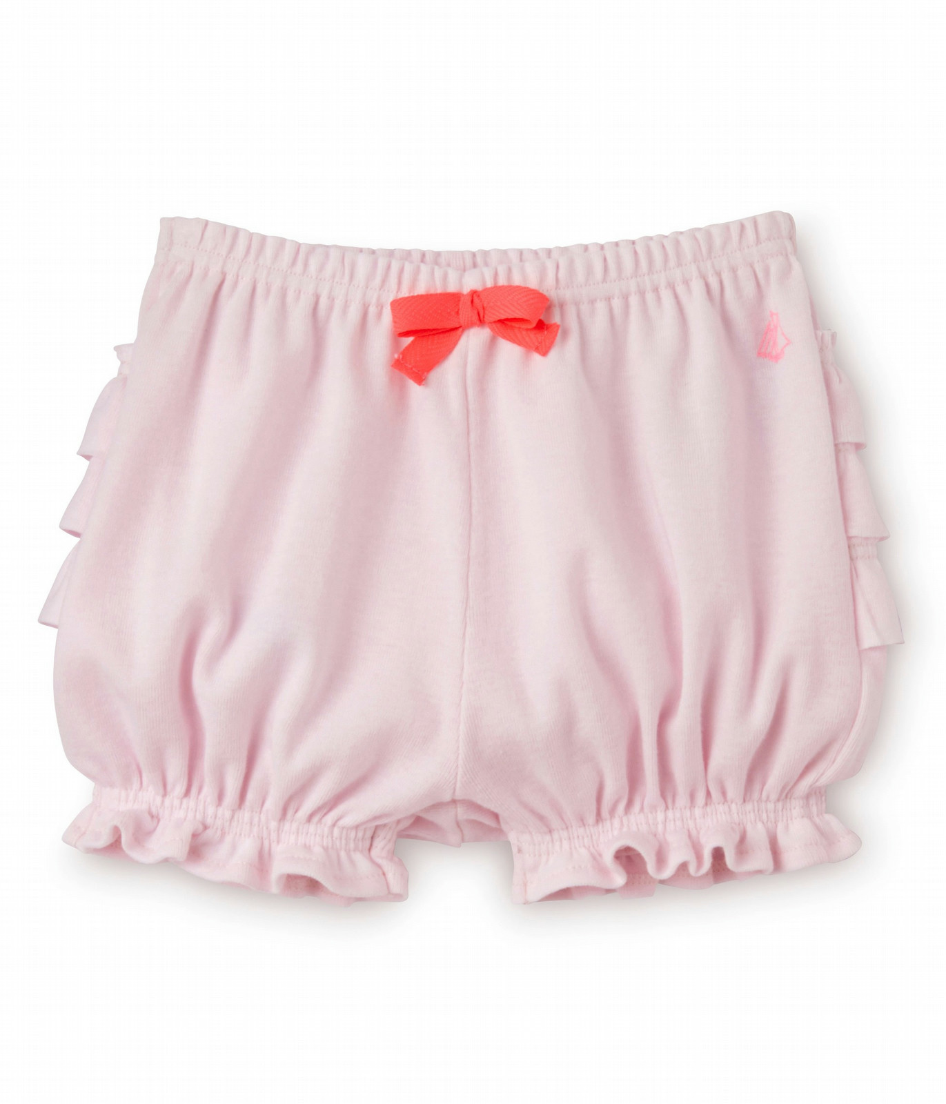 These baby girl bloomers made in plain 1x1 rib are a collection basic that now features three rows of ruffles on the back. Note the hot pink bow at the waist and the silkscreened signature sailboat. These bloomers are perfect for topping off a look, worn under dresses or like shorts with a top from the collection.
