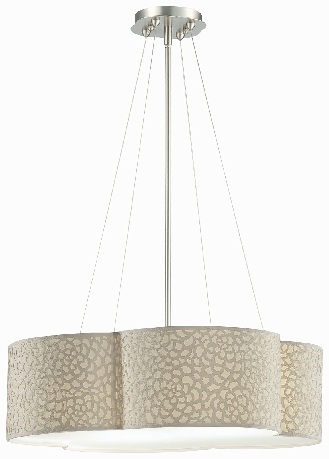 Three-light pendant in Satin Nickel finish with ivory fabric shade.
