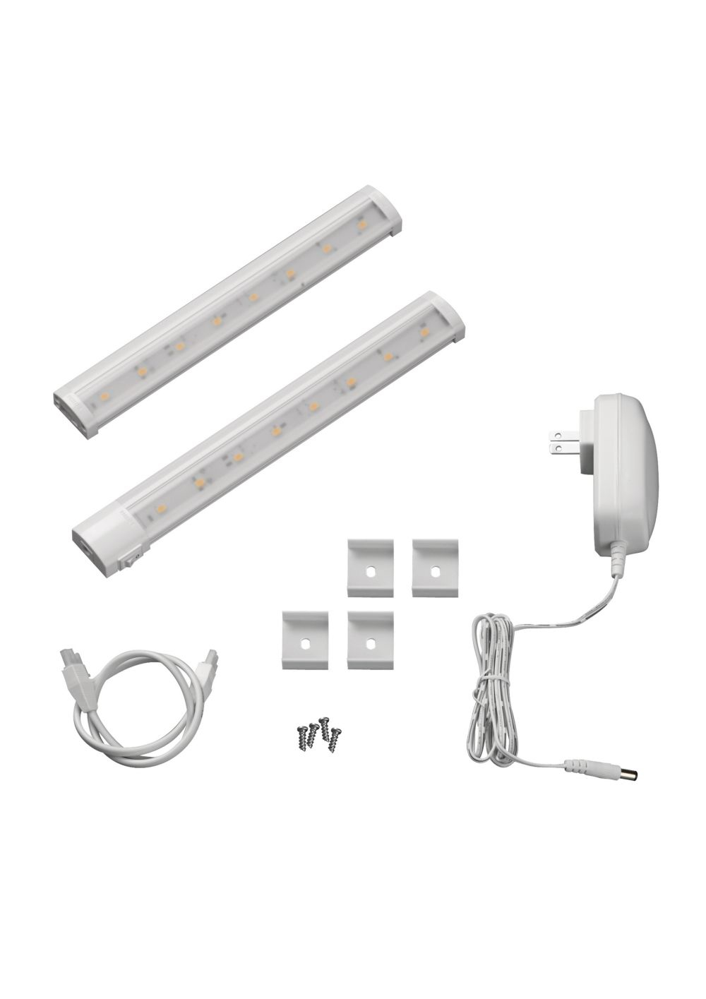 High brightness white LED under cabinet light. Kit includes two 9" strips, one 12" long jumper cable, plug-in power converter, and mounting hardware.