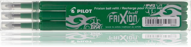 FriXion Ball, Green Write smoothly with the medium ballpoint, erase through heating without damaging the paper and start again straight away. Using a new patented thermosensitive ink, the FriXon Ball, loyal to Pilot's tradition, revolutionises writing. It has a young style with its tapered barrel and its tattoo decoration in eight colours.