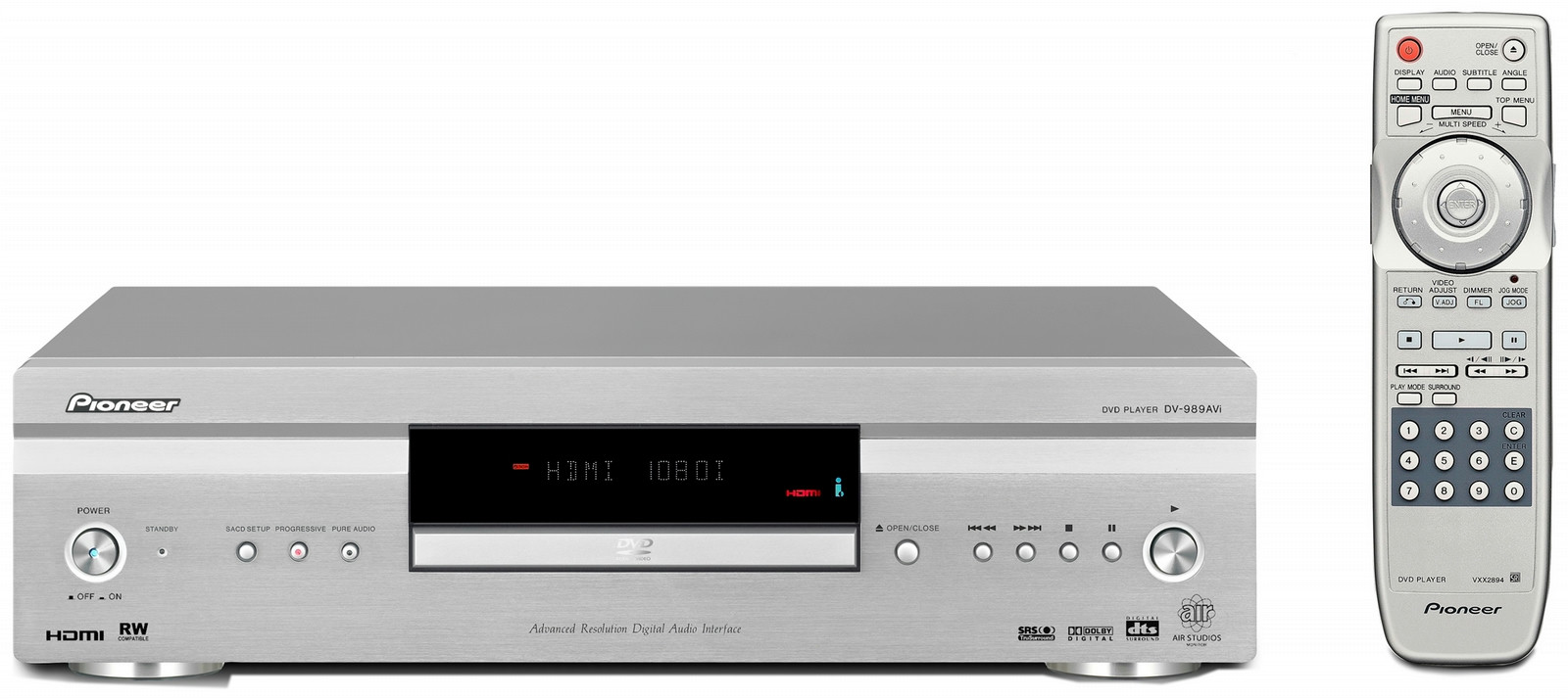 Top DVD player technology and connectivity make this new DV-989AVi DVD player the best in its class, finetuned by AIR studios London. By combining advanced digital processing, accurate video adjustments and top-quality D/A converters, this DVD player allows you to enjoy the highest level of uncompressed digital video and superb audio from original sources, with extensive media compatibility and playback including mulit-channel DVD-Audio and SACD discs.