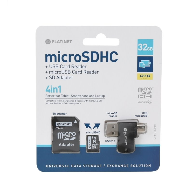 Platinet 32GB MicroSDHC + card reader + otg + adapter. Flash card type: MicroSD. Colour of product: Black. Memory adapter included: microSD, Package type: Blister