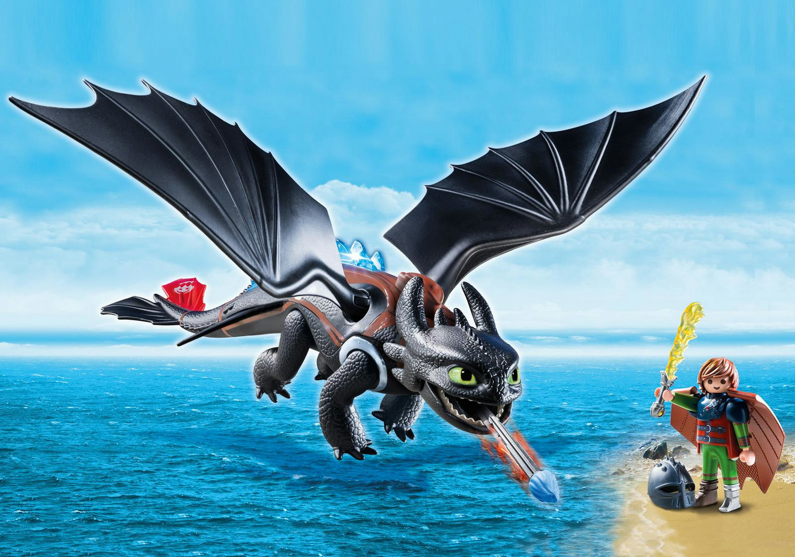 Join in all the action with Berk’s heroic duo, Hiccup and Toothless. In true Night Fury fashion, Toothless can shoot a blue fire dart from his mouth, keeping his enemies at bay. With illuminating back spikes (1 x AAA battery required), Toothless isn’t easily intimidated, and together, he and Hiccup will do whatever it takes to protect Berk and its dragon friends. Thanks to the saddle, Hiccup can comfortably sit on Toothless’ back and help him fly. Set includes Hiccup, Toothless, blue fire dart, flame sword, helmet, and other accessories. Recommended for ages four to twelve. Toothless Dimensions: 15 x 19.5 x 7.9 in (LxWxH).Warning. Choking Hazard. Small parts. Not for children under 3 years.