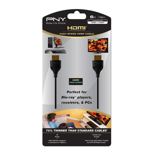 PNY's Thin HDMI to HDMI cables offer the ultimate home entertainment experience. Perfect for connecting your cable box, Blu-ray™ Disc player, HD DVD player, laptop/PC, AV receiver, or video game console to a HDTV. Offered in a slender, flexible design; these cables allow for advanced display technologies including Blu-ray 3D functionality for the ultimate 3D gaming and movie experience. With support for Dolby® TrueHD and DTS-HD Master Audio™, including 5.1 and 7.1 audio, PNY's Thin HDMI Cables offer a true digital cinema experience.