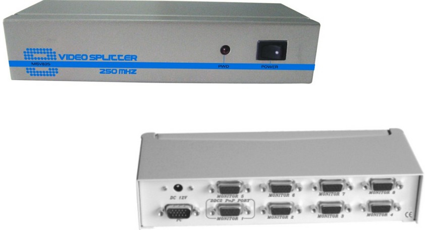 The Video Splitter takes one video signal input and amplifies/duplicates the same signal on multiple monitors. It provides flexible and cost-effective solutions for Video Broadcasting and Remote monitoring at Airlines and Restaurants, Production & Industrial Control, Security companies, Schools and Training Centers... etc.