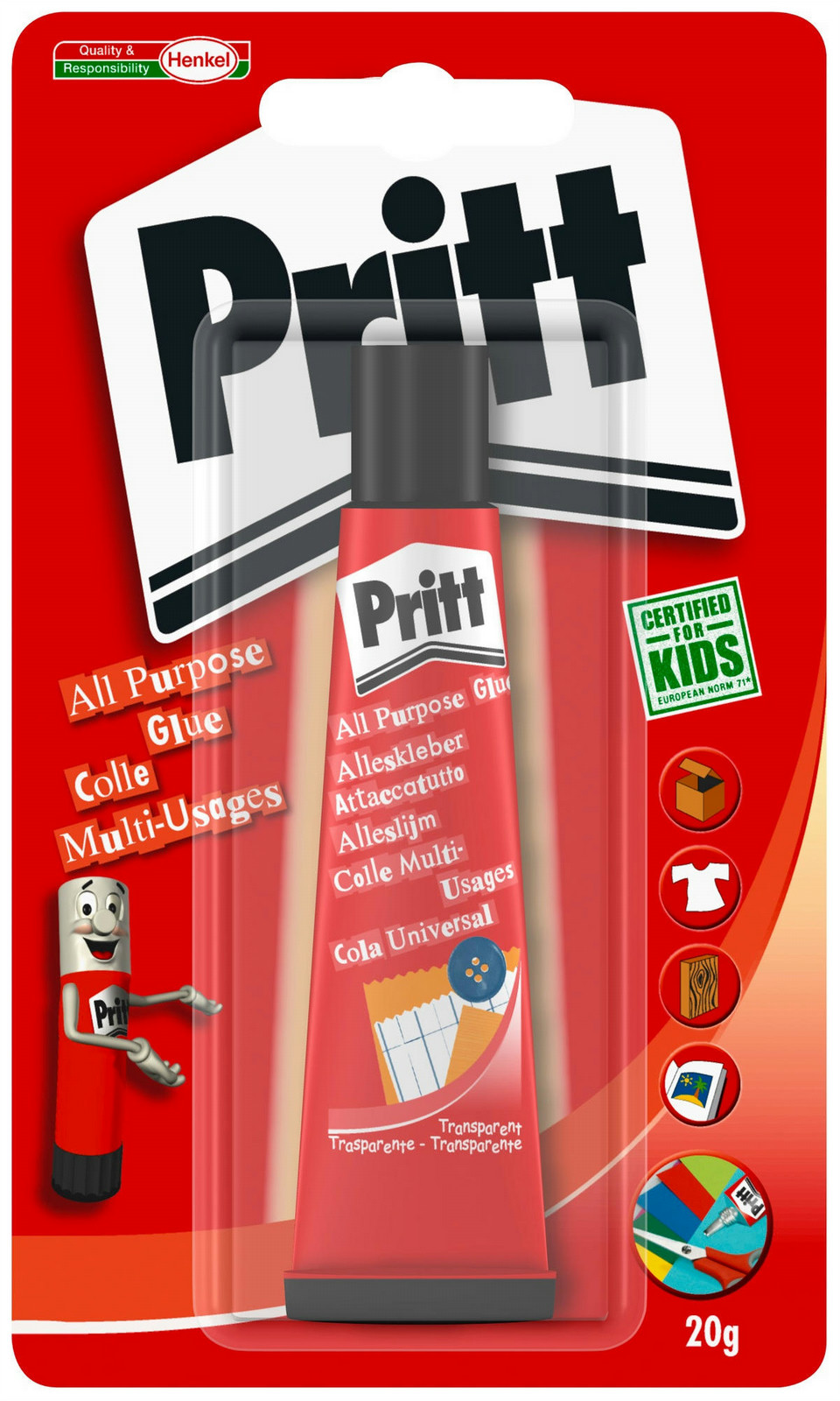 Pritt All Purpose Glue Tube. Dispenser type: Tube, Colour of product: Red, Suitable for materials: Carton, Paper. Package type: Blister