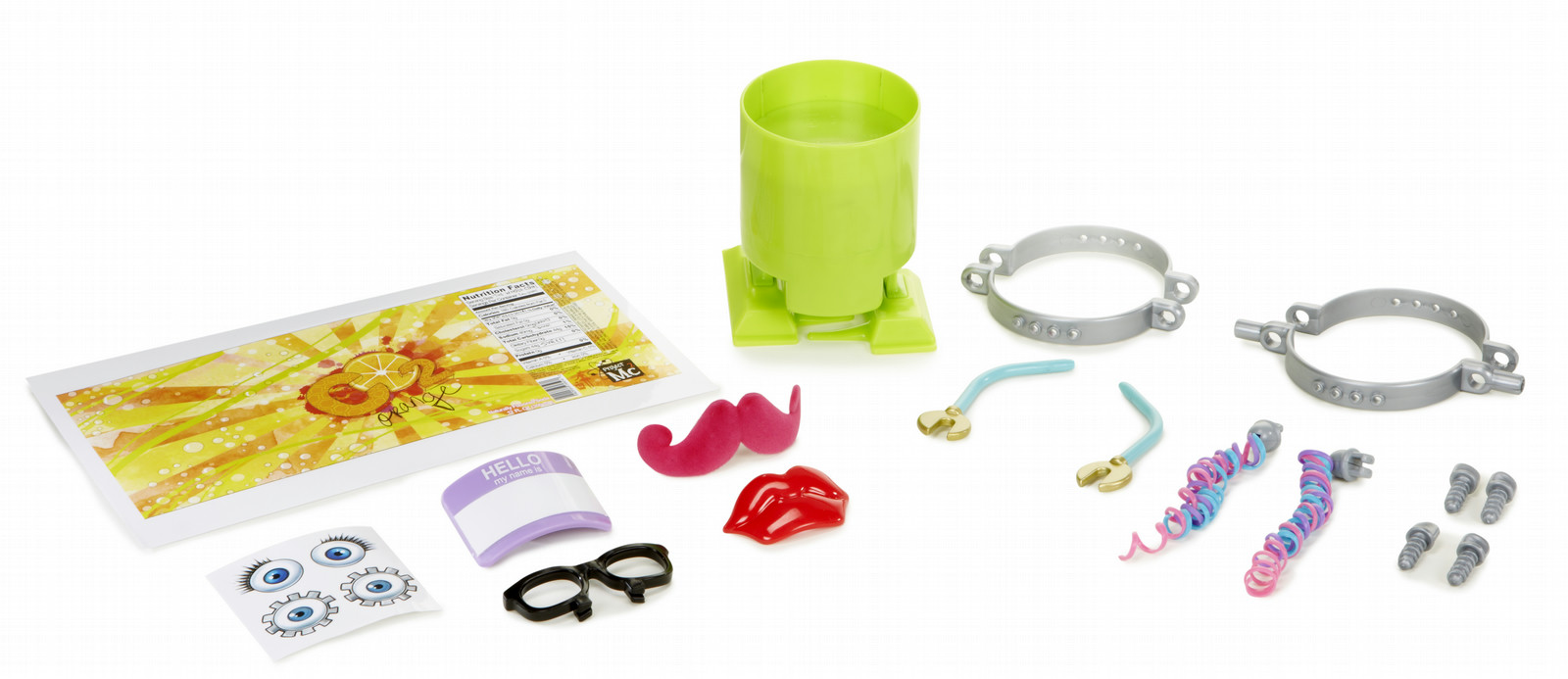 - Accessories include robot base, robot arms & hands, 2 hair clips, 2 ring clamps & screws, mustache, lips, glasses, name plate, a sticker sheet with eyes and a sticker for your soda can