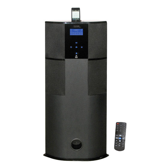 This home theater tower brings a beautiful, powerful sound system, iPod player and charger to any room of your home. The 600 watt system is just booming with power, thanks to dual 3.5” tweeters, 3.5” mid-range drivers, and a 300-watt subwoofer that packs a massive punch. Simply plug in your iPod (classic, nano, and touch models are all compatible) and you’re ready to go – plus, this unit charges your iPod, so the party only stops when you run out of music! But when you do, just turn on the built-in FM radio to keep the music flowing. There’s also an alarm clock so you can wake up to your favorite music. Don’t have an iPod? This unit is also equipped with a stereo RCA aux jacks on back – so you can plug in almost anything with stereo sound. Use the front panel touch controls or the included remote to adjust the volume, bass, treble, and even sort through your iPod’s music. The blue LCD display is bright and crisp, and the black wood finish is elegant and clean. Includes a 110 V AC to 21 V DC adaptor.