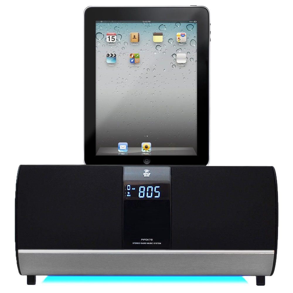 The PIPDK78 is an iPod dock-equipped alarm clock from Pyle, displaying the time using a crisp negative LCD with backlight. Listen to your favorite music and videos by simply docking your iPod, iPhone, or iPad. Now, you can wake up in the morning using to your favorite music, or use the buzzer or built-in FM radio, equipped with digital tuning and 20 presets. You can even watch video from your iDevice on your television using the composite video output jack on the rear of the device. The 3' full-range speaker broadcasts your music with stunning clarity. Or, fall asleep to your music using sleep mode, for up to 90 minutes. A 3.5mm auxillary input jack allows you to connect virtually any portable music device directly to this player, like an iPad, Android smartphone, or CD player. A backup battery ensures the time remains even if the power goes out. Runs on 110 or 220 V.