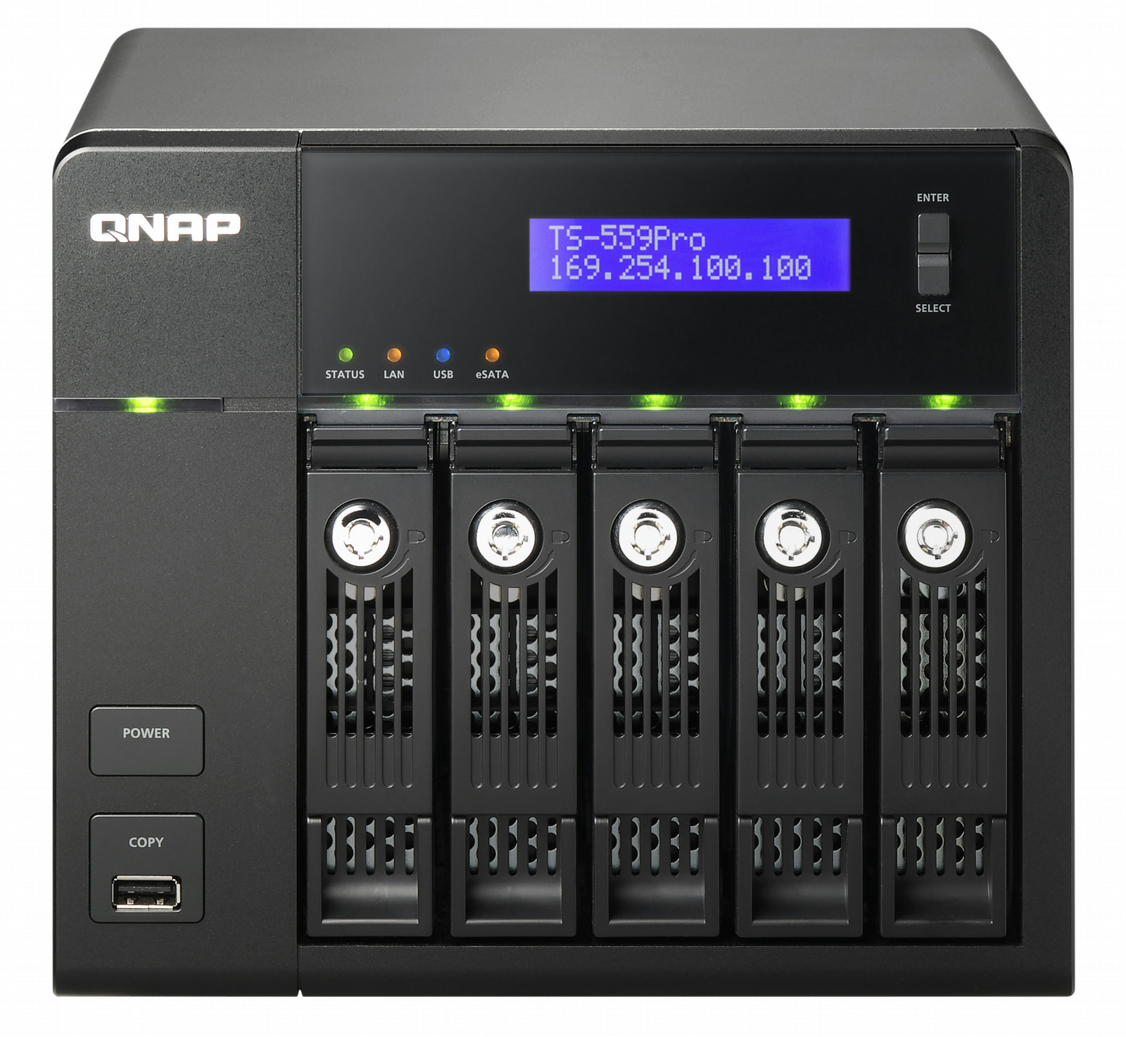 TS-559 Pro+ houses up to five 3.5-inch or 2.5-inch SATA hard disk drives, incorporates Intel® Atom™ 1.8GHz dual core processor and 1GB memory, and is capable of delivering ultra high performance, reliability, and lower power consumption during intensive data transfers. The NAS is an efficient and powerful business storage center with advanced iSCSI services, cross-platform data sharing, and all-in-one server applications. With VMware® Ready™ and Citrix® Ready™ certification, and proven compatibility with Microsoft Hyper-V environment, the NAS is an ideal shared storage solution in the virtualized and clustered environment.