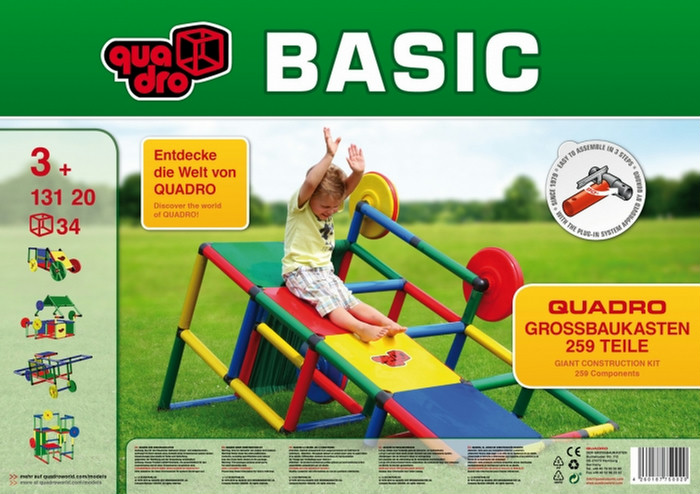 Quadro Basic Kit indoor or outdoor activity play centre for children aged 1 years and up, with 20 more models than the "Starter" activity play centre. Click on the link below to see what you can construct with this educational play equipment - from a bulldozer to a house to a space wagon!