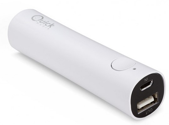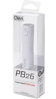 Quick Media PB26. Colour of product: White, Charger compatibility: Watch. Battery technology: Lithium-Ion (Li-Ion), Battery capacity: 2600 mAh, Charging source: USB. USB input port type: Micro-USB. Width: 24 mm, Depth: 99 mm, Height: 24 mm. Cables included: Micro-USB