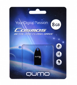QUMO Cosmos 8GB. Capacity: 8 GB, USB version: USB 2.0, USB connector: Type-A. Form factor: Capless, Colour of product: Black, Material: Zinc steel. Package type: Blister