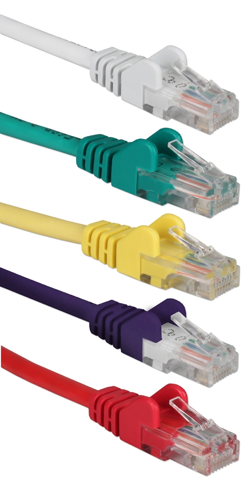 Connects any CAT5e application such as computer to hub, patch panel, wall jack, router, or gaming console. This 350MHz CAT5e PVC stranded patch cord supports all CAT5e/RJ45 and other high speed applications. It has molded snagless boots to prevent damage to the connector and stranded wires for added cable flexibility. Includes 5pc per bag with White, Red, Green, Yellow and Purple cables.