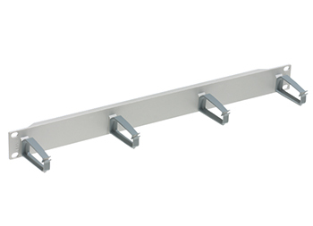 Plastic plate with four mounted jumpering brackets. For a neat, horizontal routing of patch cords between patching fields. The reinforced plastic plate and snap-in jumpering brackets provide additional stability and quick mounting.