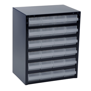 Cabinet with 24x250-1 drawers. Each drawer can be divided into 4 compartments. Cabinet made of painted steel and drawers made of polypropylene (PP).
