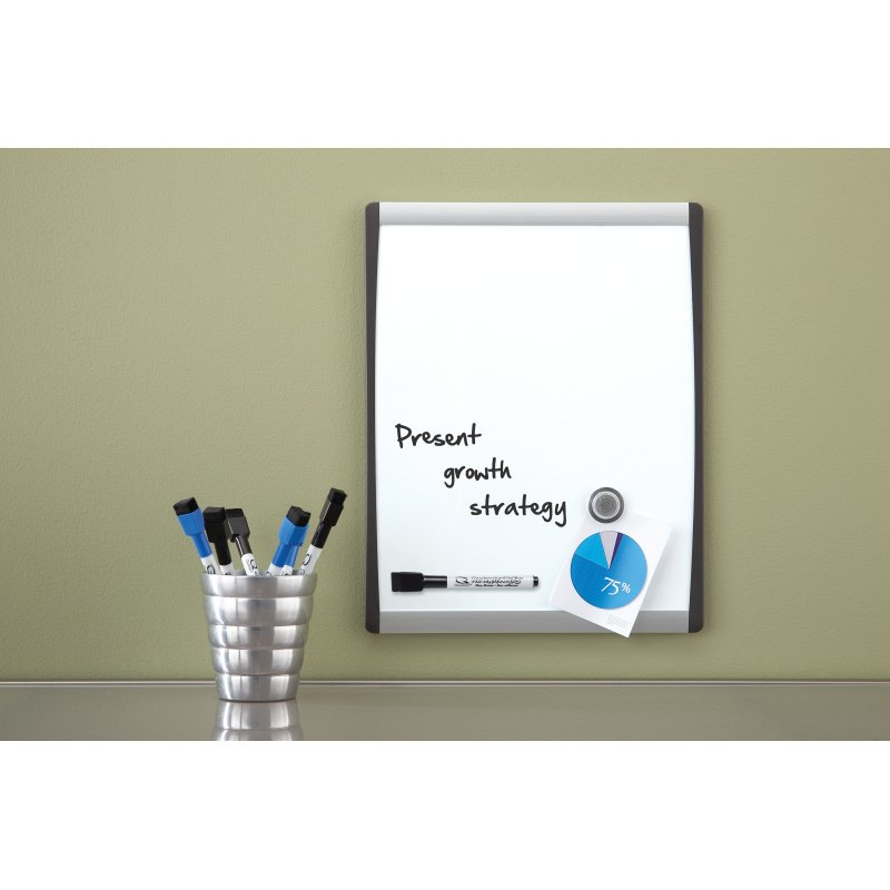 - Feature a tough magnetic dry-erase surface; Stylish black and silver arched frame; Available in three sizes; Board includes mounting magnets, tape, foam adhesive tape, marker and two magnets