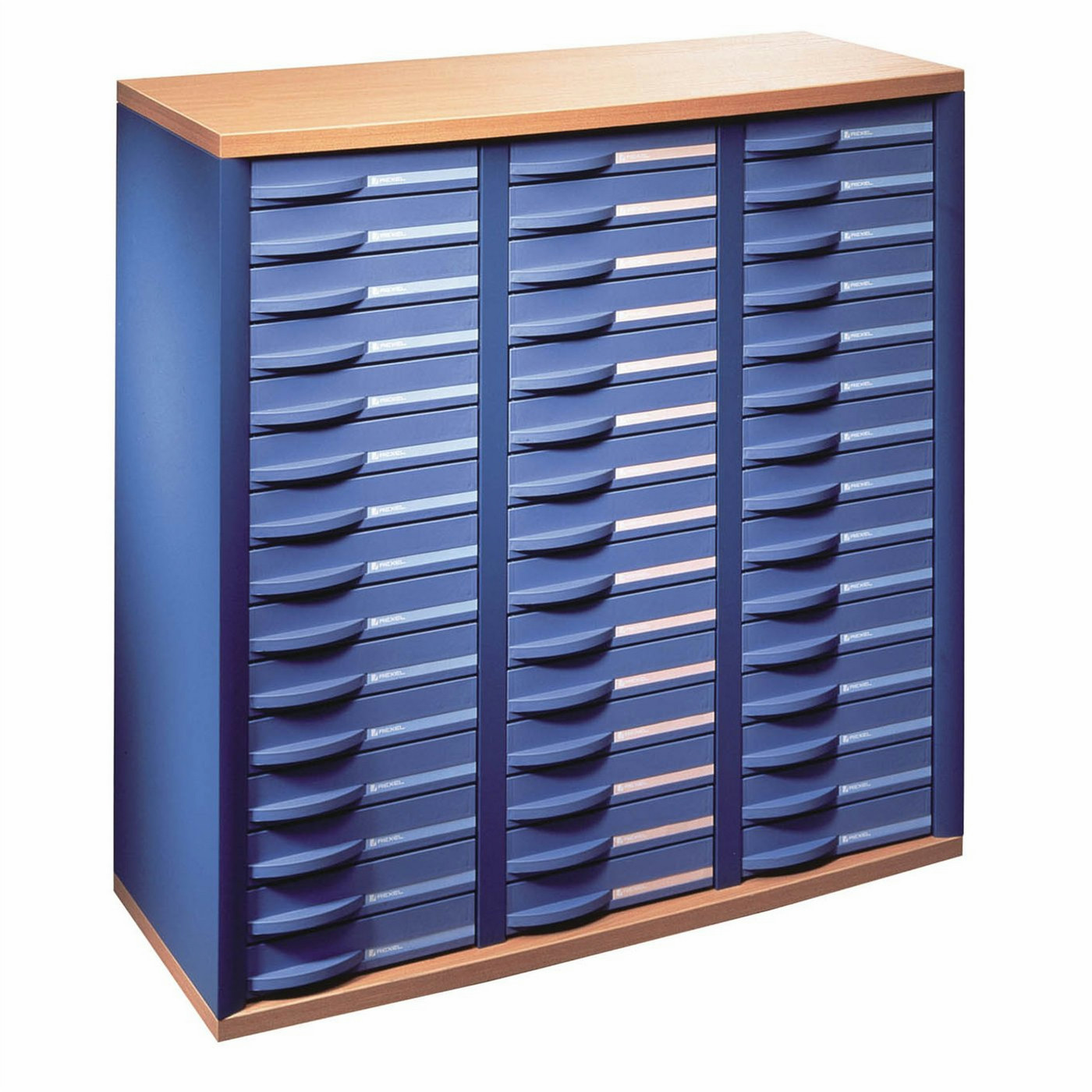 Ideal for keeping files in easy reach of your desk, Stratis™ 45 Drawer Cabinets provide a stylish and compact filing solution. Weighing 42kg and arranged in three columns each with 15 x 55mm high robust plastic drawers, the cabinets have a strong metal frame and sturdy timber top and base. They include wide multicoloured labels for easy identification of contents.