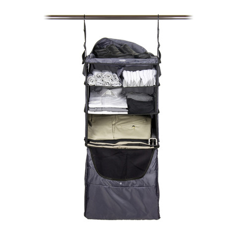 The Riser Collapsible Shelf Inserts are the perfect accessory to add to any piece of your luggage. One Riser will fit in a carry-on bag and two of the Risers will fit in a full-size suitcase. Our new Risers also are fully compatible to fit inside our Slider and Glider rolling carry-on models as well. These collapsible shelf inserts feature our innovative laundry compartment to keep dirty clothes separate from clean ones and an integrated shoe and toiletry pocket. Each shelf can hold up to 20lbs, so you never have to worry about over loading it. The hooks are made of high-strength steel and are adjustable so that you can raise or lower the height of the bag depending on your needs. Riser Collapsible Shelf Inserts are equipped to hang in a closet or on almost any door. The Riser will revolutionize the way you travel!