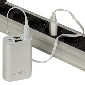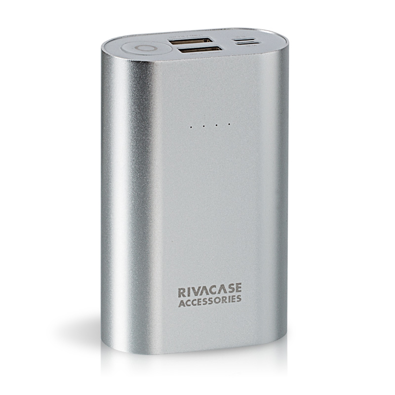 Rivacase Rivapower VA1010. Colour of product: Silver, Housing material: Aluminium, Charger compatibility: Tablet, Smartphone. Battery technology: Lithium-Ion (Li-Ion), Battery capacity: 10000 mAh, Charging source: USB. USB input port type: Micro-USB. Width: 95 mm, Depth: 29 mm, Height: 58 mm. Cables included: Micro-USB, Adapters included: Lightning