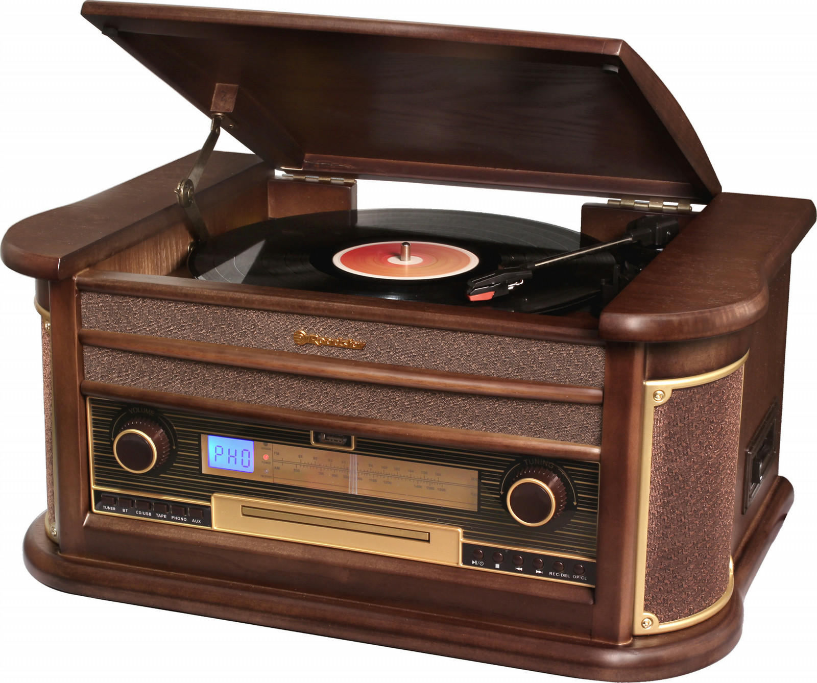 Wood Retro Style FM-Radio with Turntable, Cassette, CD Player, Direct Encoding, Aux In and Bluetooth.