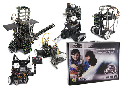 Robo Kit #5 The Roborobo Robot kit helps children understand robot technology based on the useful and various assembly components such as CPU board, contact sensor board, infrared sensor, DC motor & servo motor, and remote control etc. In addition, it is not hard to assemble/disassemble at any time because it has a safe circuit module(welding is unnecessary). They can learn how to assemble & disassemble every kinds of robot, how to control the robot by their self- initiated programming skill. In the whole process of assembling & disassembling and programming activity, they can strengthen the spatial perception, develop the brain power and easily access to programming skill.