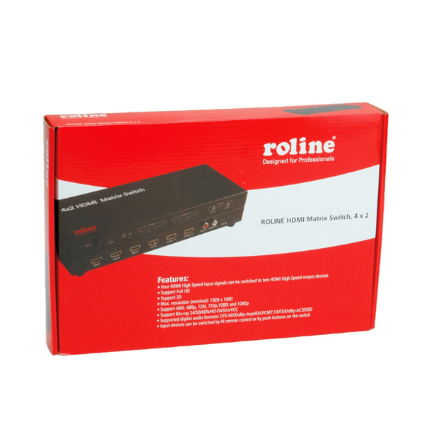Input devices can be switched by IR remote control or by push buttons on the switch