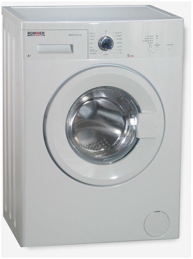 ROMMER White 615 A+. Case design: Freestanding, Loading type: Front-load, Colour of product: White. Drum capacity: 5 kg, Maximum spin speed: 600 RPM, Washing class: A. Energy efficiency class: A+, Energy consumption washing per cycle: 0.85 kWh, Water consumption per cycle: 43 L. Width: 595 mm, Depth: 510 mm, Height: 850 mm