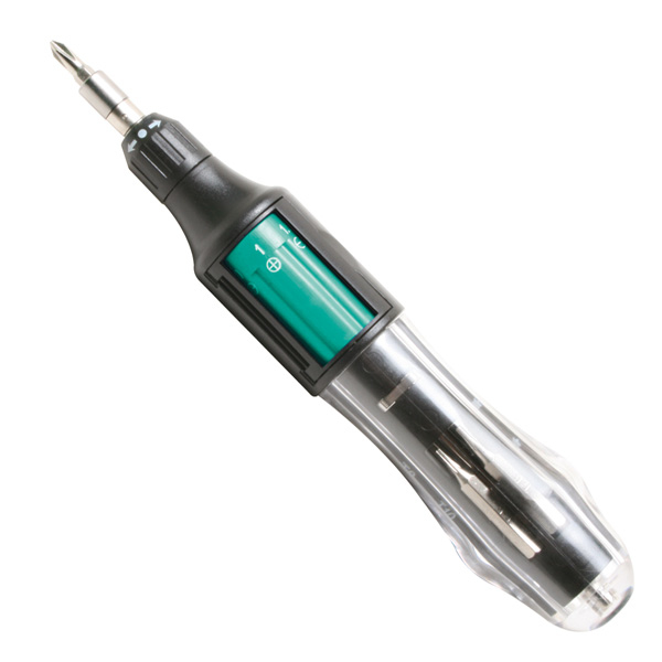 10-in-1 Auto Loading Ratchet Screwdriver Set <ul><li>Precision screwdriver features 3-way gearless ratchet with twist reverse for efficient operation</li><li>Pump-action design for easily and quickly auto-loading bits exchange</li><li>Ergonomically non-slip handle provides user comfort</li><li>Rotatable marked barrel for 6 bits pre-loading and storage</li><li>3x Philips bits (PH00, PH0, PH1)</li><li>3x slotted bits (1.5 mm, 2 mm, 3 mm)</li><li>4x Torx bits (T5, T6, T8, T10)</li></ul><br /><ul><li>Content: Screwdriver, 10 bits</li></ul>.