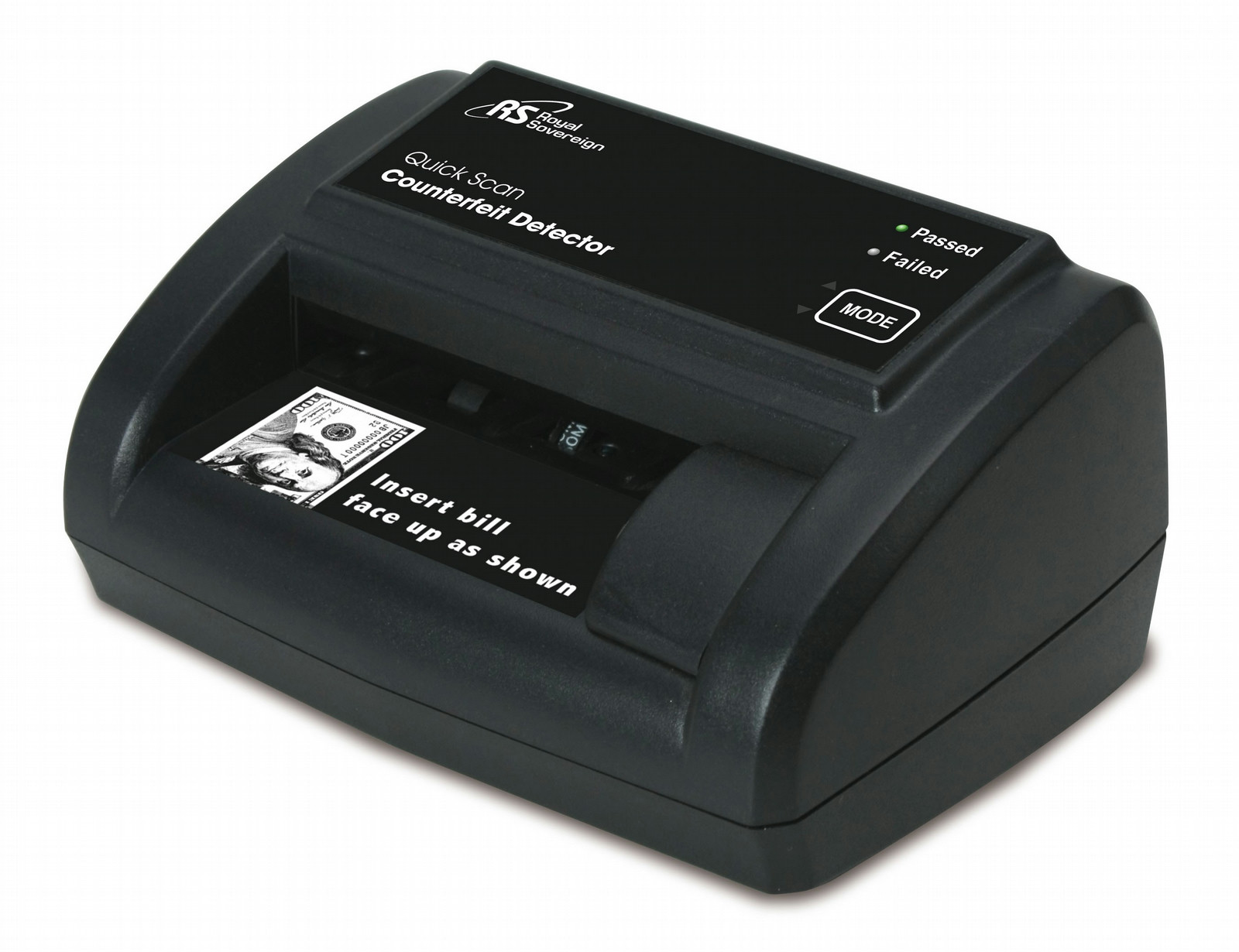 The Royal Sovereign RCD-2120 Quick Scan is a counterfeit detector that detects fake bills through instant scanned readings. No longer will you have to keep your customers waiting in line while you or your employees manually check for counterfeit bills. The Royal Sovereign Quick Scan provides accurate counterfeit readings in just half a second and works with 5s, 10s, 20s, 50s, and 100 dollar bills.
