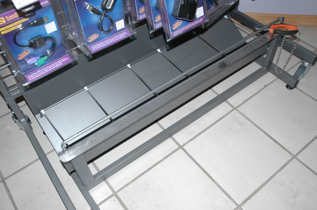 Cable drum holder for large rolls of cable that can be cut to length by the customer. Integrated length measure and cutter tool included.