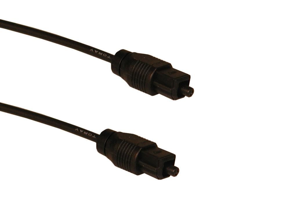 Optical cable for connecting digital audio devices. The optical cable reduces signal loss and therefore provides better audio quality than a traditional copper cable. This cable has Toslink connectors at each end, the most common type of optical connector for audio.