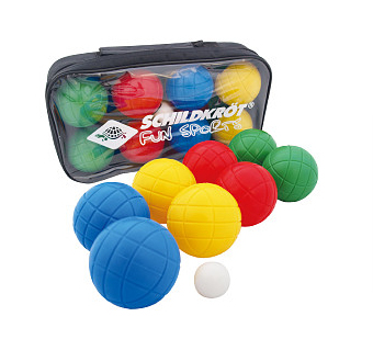 4 x 2 plastic bowls (Ø 7,25cm), 1 small target ball, 1 measuring tape, in a high-quality black nylon transparent front carry bag, zipper and handle (23x16x8cm) imprinted with the Schildkröt Fun Sport logo.