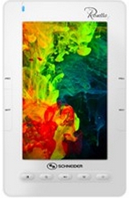 Schneider Rosetta5 White. Technology: TFT, Display resolution: 800 x 480 pixels. Document formats supported: ePub, FB2, PDF, TXT, Audio formats supported: AAC, APE, FLAC, MP3, OGG, WAV, WMA, Image formats supported: BMP, GIF, JPG. Interface type: USB 2.0. Colour of product: White. Cables included: USB