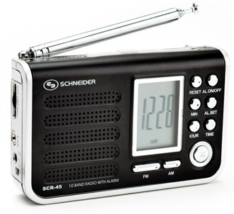 Schneider SCR45. Radio type: Portable, Tuner type: Analog. Display type: LED. Headphone connectivity: 3.5 mm. Depth: 22 mm, Height: 63 mm, Weight: 102 g. Battery type: AAA