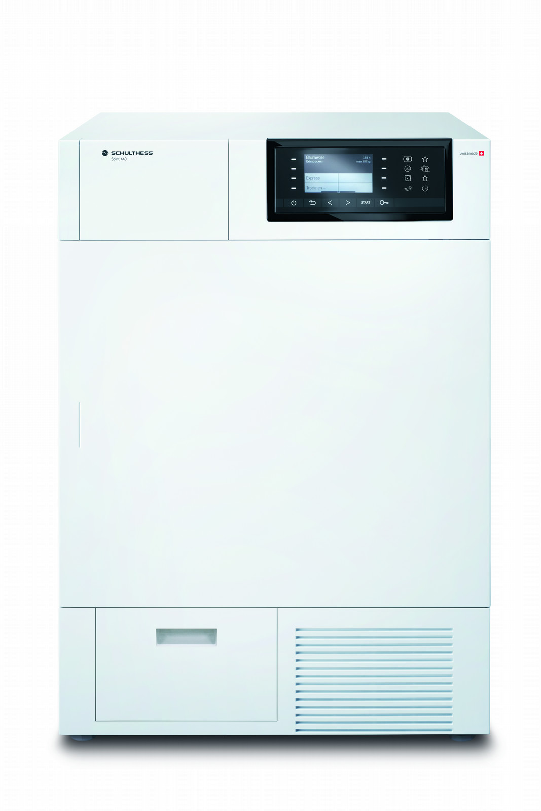 Schulthess Spirit 440. Case design: Freestanding, Loading type: Front-load, Drying system: Heat pump. Drum capacity: 8 kg, Drying class: B, Cycle time: 131 min. Energy efficiency class: B, Energy consumption: 4.59 kWh, Annual energy consumption: 534 kWh. Width: 595 mm, Depth: 640 mm, Height: 850 mm