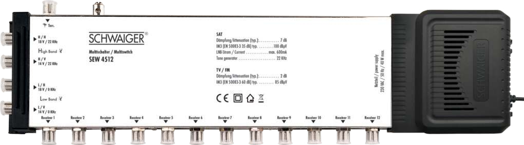This SCHWAIGER multi switch is used to distribute digital signals of 1 satellite position to up to 12 subscribers. You can feed signals from the Quad or Quattro LNB as well as terrestrial signals. All subscribers can make use of the entire range of programmes independently from one another. A special feature of this multi switch are the differently coloured connections to avoid mix-ups upon installation.