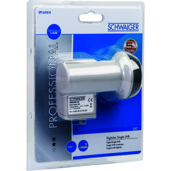 This SCHWAIGER® single LNB, which is suitable for multifeed systems, is used to establish digital-enabled satellite systems for 1 subscriber. The F connection is protected by an extendible weather-resistant cover.