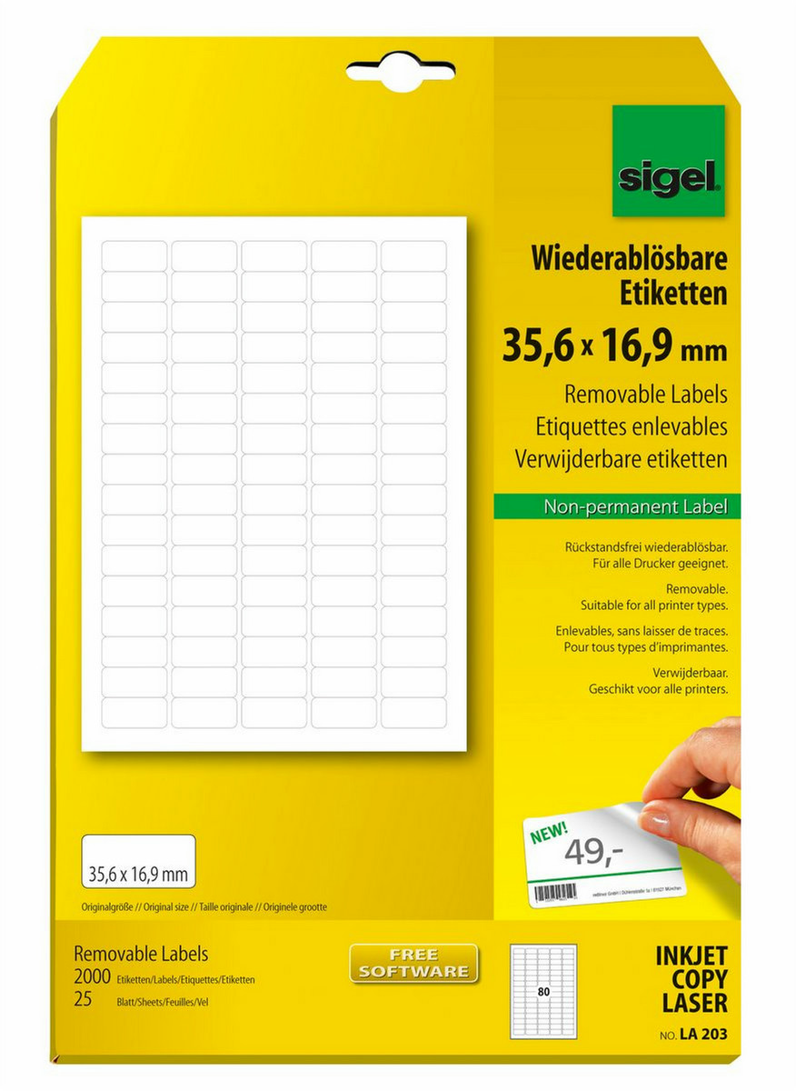 Die weißen wiederablösbaren Etiketten mit abgerundeten Ecken im Format 35,6x16,9 mm sind hervorragend geeignet für den zeitlich befristeten Einsatz oder für wechselnde Kennzeichnungen. Die Etiketten sind für alle InkJet- und Laser-Drucker sowie Kopierer geeignet und sorgen für ein klares Druckbild und optimale Geräteschonung dank 4-seitiger Sicherheitskante. Sichere Haftung auf allen glatten Oberflächen und trotzdem rückstandsfrei wiederablösbar. Im Lieferumfang sind 25 Blatt A4 bzw. 2000 Etiketten enthalten.