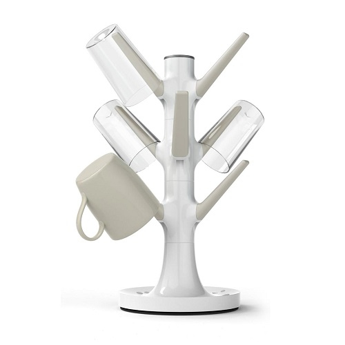 The cup tree, with its 9 prongs on 3 levels well separated to allow you to leave the washed mugs, cups and glasses to dry by themselves. The silicone cap at the end of each prong serves a perfect cushion for the fragile items to land on.