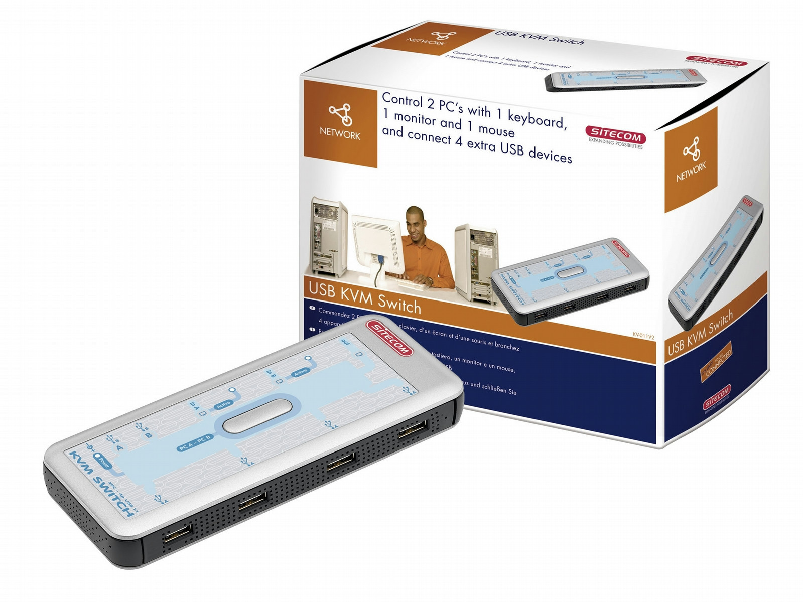 The KVM USB switch kit allows you to control 2 PCs in the same room with 1 monitor, 1 keyboard and 1 mouse, which means you save a lot of space. The KVM USB switch has 4 extra USB ports on the front. This means you always have extra connections for USB devices such as a card reader or printer with a transfer speed of up to 12 Mbps.