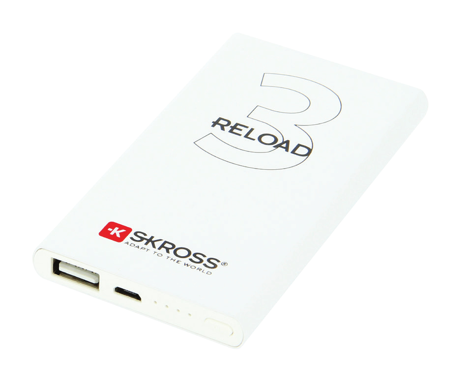 Skross RELOAD 3. Colour of product: Red, White, Charger compatibility: Universal, International Protection (IP) code: IP20. LED indicators: Power. Battery technology: Lithium, Charging source: USB. Cables included: Micro-USB